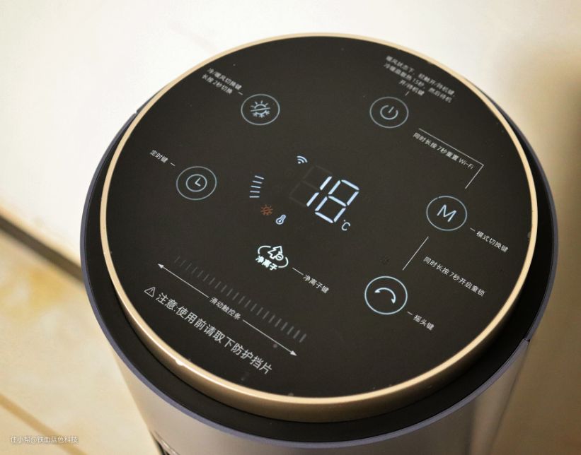 这款冷暖扇顶部为控制区域,其采用了大屏触控面板,实时显示温度,操作面板主要的功能有:开关键、冷暖风切换键、定时键、净离子键、摇头按键、模式切换键等,操作起来非常便捷,而且触摸屏显示非常清晰,触摸非常灵敏,此外,还提供了童锁健,同时按住模式切换键+摇头键7秒,会开启童锁键,有效的避免家中的熊孩子乱操作,减少安全事件的发生。