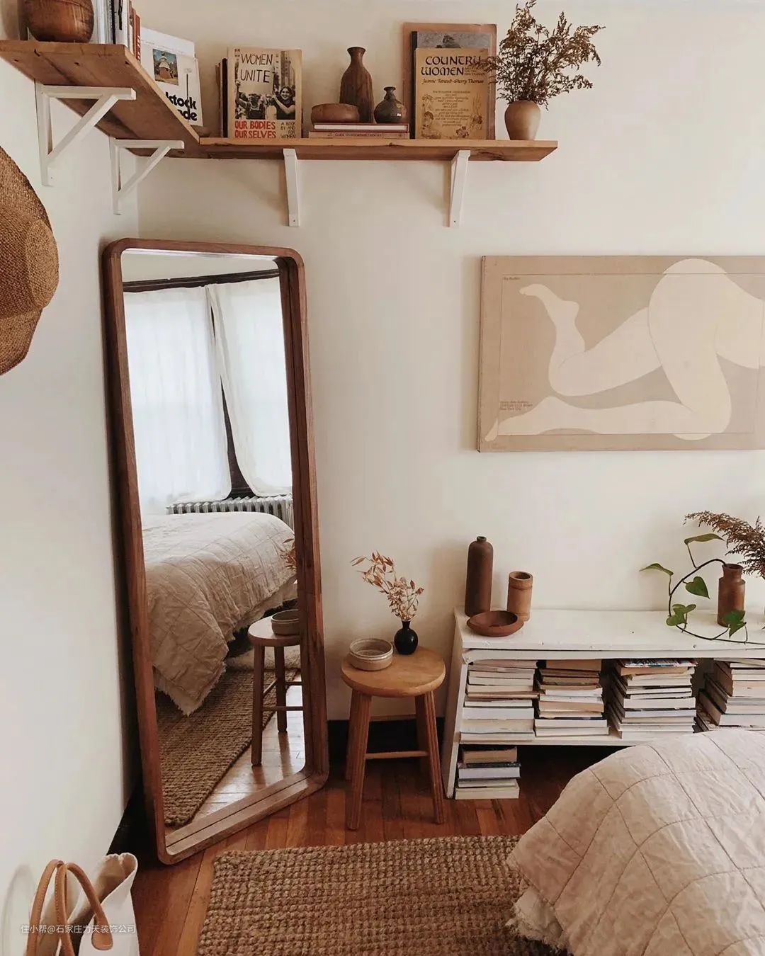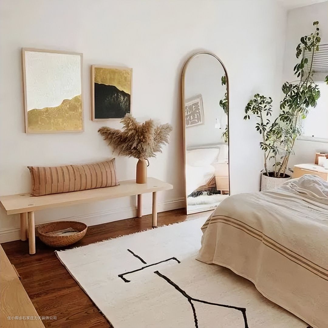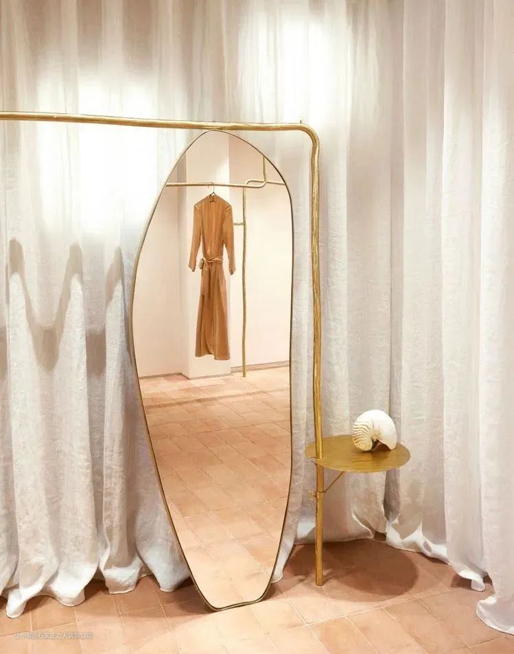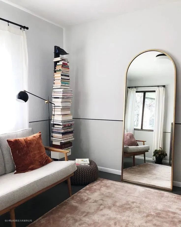 拱形镜多了一些柔和圆润的曲线,让造型看起来更加优雅动人,和周围的沙发、书籍搭配在一起,可以互相中和。镜子长度足够的话,随手一拍都是大片。