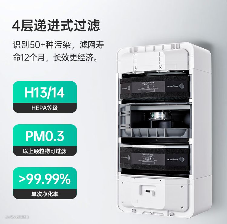 从过滤系统来看:AC-160采用4层递进式滤,可以识别50+种污染,同时采用专利混风技术,提升87%的滤网寿命。