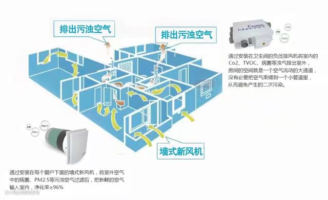 但你可以理解为一个设备负责把外面的空气过滤之后送进来,另外一侧也有设备把室内的空气排出去,这样的循环就形成了一个新风流动层,达到了换气的效果。