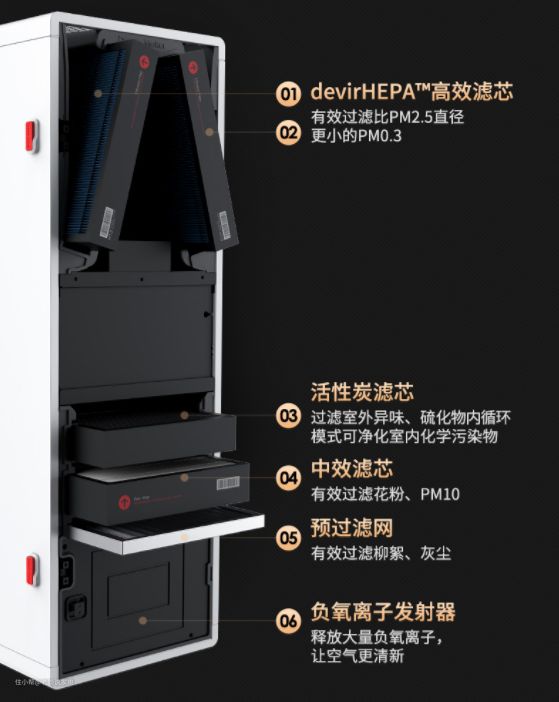 从过滤系统来看:采用行业内少有的五层塔式滤网结构,不仅能有效提升滤芯寿命,拦截更多的污染物、提升净化效率和防止二次污染,让净化更彻底。