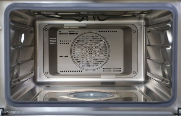 内胆的材质是304不锈钢, 它的顶部和背部都有4根加热管+背部风机,同时温场仿真模拟48个热能风孔,整个均匀控温的环境能把食物烤透烤均匀,另外利用360°立体热风加热以及超大进风口,可以让食物均匀受热,同时顶部加热可以避免水蒸气凝固滴落到食物上面影响口感。