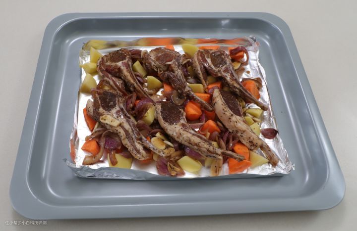 - 将羊排600g、盐6g、糖2g、黑胡椒3g、生抽10g、蚝油10g、洋葱半个、大蒜6瓣混合均匀,盖保鲜膜腌制最少2小时,烤盘上垫锡纸,铺满土豆块和胡萝卜块,把羊排和腌料都放上去。