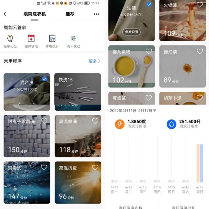 洗衣机和烘干机的程序也是一目了然,家里老人操作也很快上手,洗衣机和干衣机分别有14种程序,这里就不赘述。