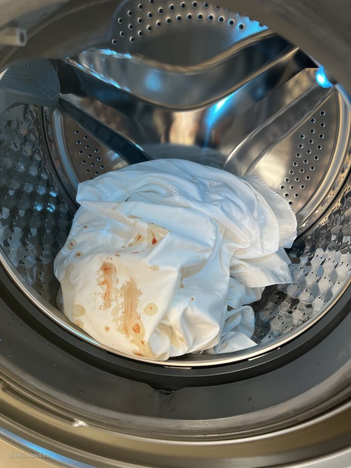 清洗时,蓝氧发生装置就可以深入织物深层与衣物上的有机物进行反应,有效去除附着污渍,同时能够对游离在水中的颜料有机物进行分解,避免混洗时衣物染色,蓝氧特渍净还可以对白色的衣服起到净白亮色的效果,让衣物保持崭新。 我拿了几件发黄的白衬衫测试去污能力。而且咱们为了极限测试,把几件衬衫都抹上了番茄酱、酱油、可乐,并且放置了15分钟。