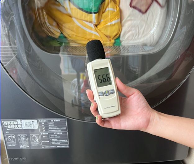 4.洗衣噪音测试 我个人测机器的时候都比较注重噪音,因为我们很多时候只有晚上下班回来才有时间洗衣服,如果洗衣机太吵会影响到周围邻居要被投诉的,加上有时我也会被楼上或者楼下洗衣服的噪音吵到,所以我更加坚定的考虑了噪音小的洗衣机。 靠近运行中的洗衣机测了测,两个机器一起运行噪音大概为56分贝,基本上不会有任何影响 ,比吹风机的声音还要小很多。