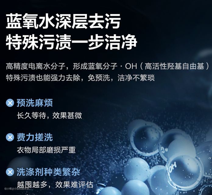 一、本色洗衣机配置&实测效果 1.蓝氧特渍净 洗衣机和传统的水魔方、超微净泡清洗方式不同,小天鹅本色洗烘套装上带来了全新黑科技——蓝氧特渍净。