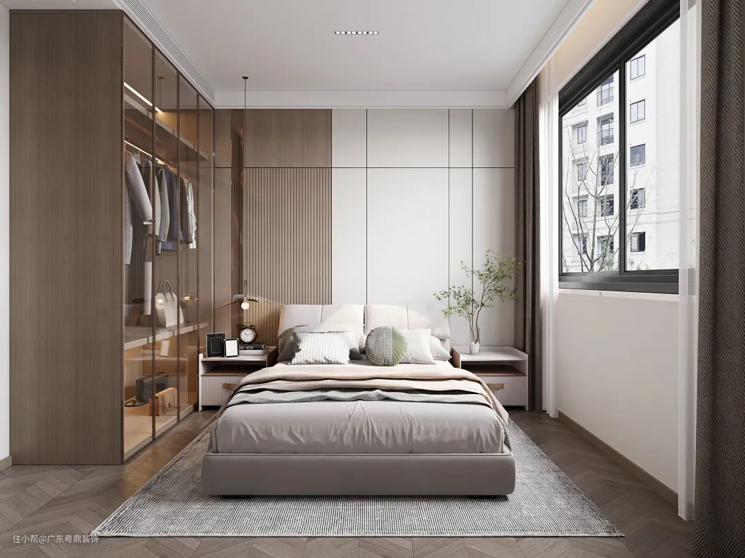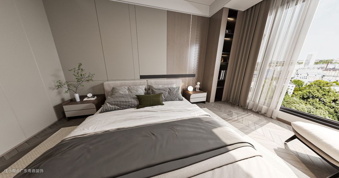 整个卧室的装修以浅色系为主,融合现代风的温情,打造简单且精致,时尚又舒适的卧室居住空间。 卧室落地窗的设计,大大增强了采光。