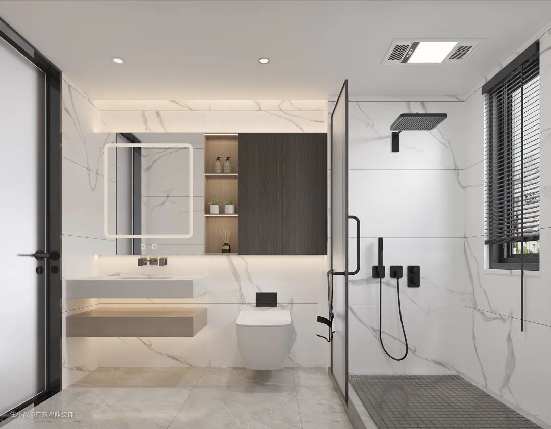 客卫采用干湿分离,将洗漱区外置,同时考虑潮湿区的日常打扫,最大化使各角落视线可见。