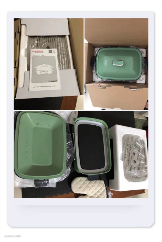 将主锅的箱子打开后可以看到里面放置了一本说明书,蒸盘,拿来蒸盘后可以看到锅盖、深煮锅以及锅体,还很贴心的配送了一个防烫手套~(在这里由衷的说一下,摩飞家的锅质量是真的好,每个部件的手感都超好,滑溜溜的,大牌制造就是不凡!!!)