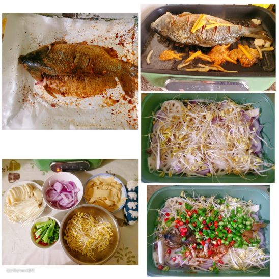 烹饪过程:先把煎烤盘放在发热盘上面预热几分钟,好了后放生姜、蒜爆一下,然后放鱼煎至两面黄(8分钟),盛处盘里备用,接着把煎烤盘换掉放深煮锅,把豆皮、豆芽、洋葱、莲藕、金针菇铺底,倒入清水,调至最高档煮一会,煮沸后放入煎好的鱼、切好的辣椒,盖上焖一会加上调料就可以了,加热的速度非常快,整个过程只用了25分钟左右。