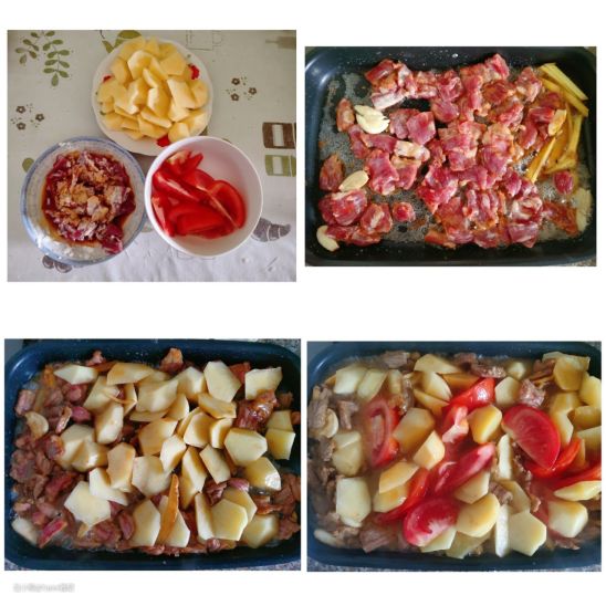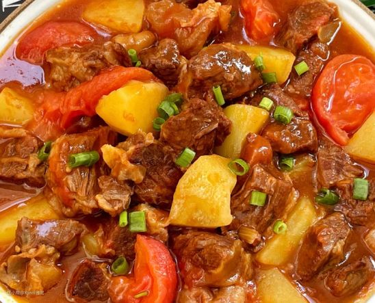 烹饪过程:土豆去皮与西红柿一起切块,牛肉洗干净后切块腌制一会,然后下锅翻炒至变色,倒入土豆块接着翻炒,土豆炒到一半熟,放入西红柿,翻炒出汁后倒入2勺生抽、半勺老抽、2勺蚝油,倒入适量的清水,调最高档焖一会,再调最小档焖25分钟左右,盛出之前放入少许的胡椒粉和葱调味收汁就可以了,喜欢汤汁多一点的可以收汁时间短一点,拌饭吃真的很美味~