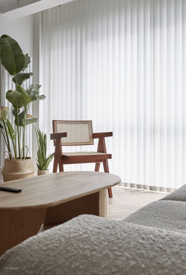 当然你也可以直接选择竖百叶,因为竖向百叶垂直于地面,看起来和纱帘的褶皱一样,无形中会拉高层高,但是又能通过调整角度决定透光度。