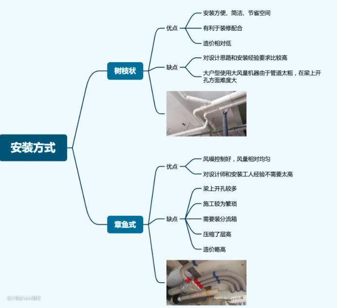 还有一种方式,管道布设好以后,看起来像一条八爪章鱼,所以也叫章鱼式。它的思路就是从主机箱子里出来,然后静压箱,然后通到多个管路。这种方式大多数采用PE管,强行用PVC管,也是可以的,只是施工难度大,一般不采用。