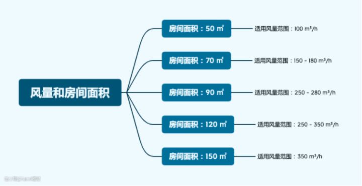 一般卧室按 50 平米以内来算的话,得要至少 100 风量的机子,150 - 180 风量大概可以覆盖 70 平米以内的面积,以此类推,具体标准可以参考这个图。