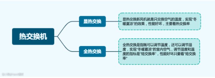热交换器也分为温度和湿度调节,如果是只进行温度交换的叫显热交换,把温度和湿度都调节的叫全热交换,显然,全热交换更舒适也更加节能,比显热交换领先,目前市面上主流的都是全热交换的产品了。