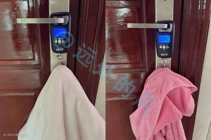 称重表称重显示毛毯的重量在0.68公斤,大毛巾的重量是0.525公斤;