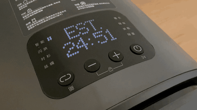 我用一件刚从洗衣机拿出来的湿t恤来测试其烘干是否真的智能,为此我还专门买了一个专业级别的含水仪,测出了烘干前的湿度是3.9%,闪烘模式结束后的湿度达到了完全的0%,15min即可做到烘干。
