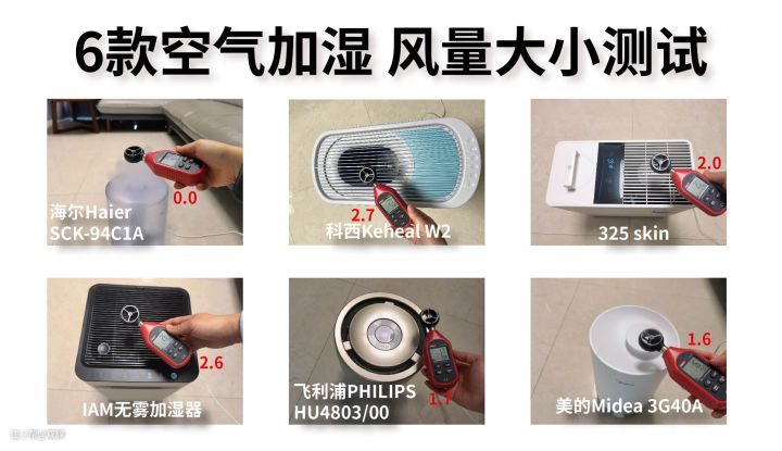 这一项测试是针对加湿器的风量运行进行测试。对于加湿器来讲,出风量的大小也是决定加湿器加湿速度快慢的因素。每款加湿器都开到最大档,采用测风量仪进行测试,结果如下: