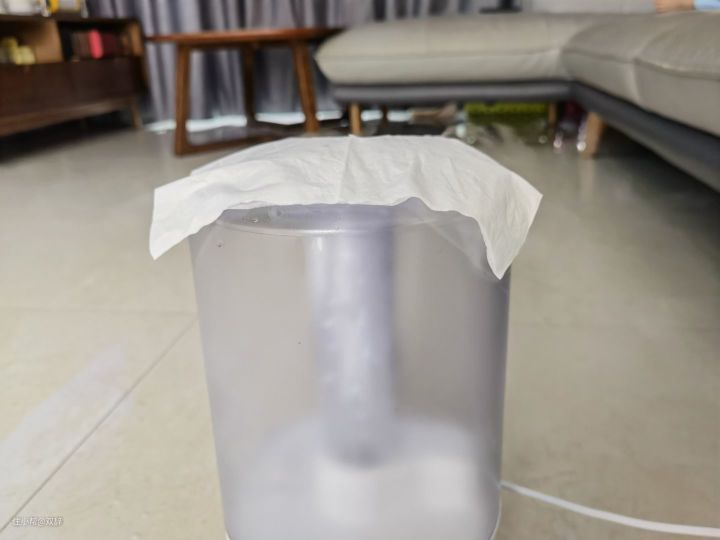 而另外两款加湿器,即美的加湿器和海尔加湿器,属于有雾型加湿器,以下是其测评的结果: 为了更直接的体验加湿器的喷雾大小,我采用最大加湿模式,用纸巾覆盖1分钟,在相同的条件下对美的、海尔这两款加湿器进行了测试 美的喷雾测试: