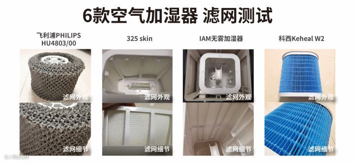 从材质上分析,科西采用的是高密度加湿棉,主要的材质是无纺布,通俗点讲就是口罩的材质,加湿棉的抗菌率可以达到99.9%;;IAM滤网是由三种分子纤维聚合而成、352的滤网是由三种高分子纤维聚合而成,飞利浦采用的是可换洗滤网FY2401。海尔与美的没有滤网,不做比较。