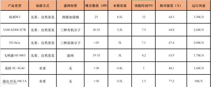 这次市场上热门的科西W2、IAM SZ800 X7B、352 Skin、飞利浦 HU4803,海尔 SCK-94C1A、美的 SC-3G40这6款产品进行综合测评,从外观、加湿模式、滤网配置、噪音测试、水箱容量、喷雾大小、加湿速度以及运行风量这8方面为大家进行测评。