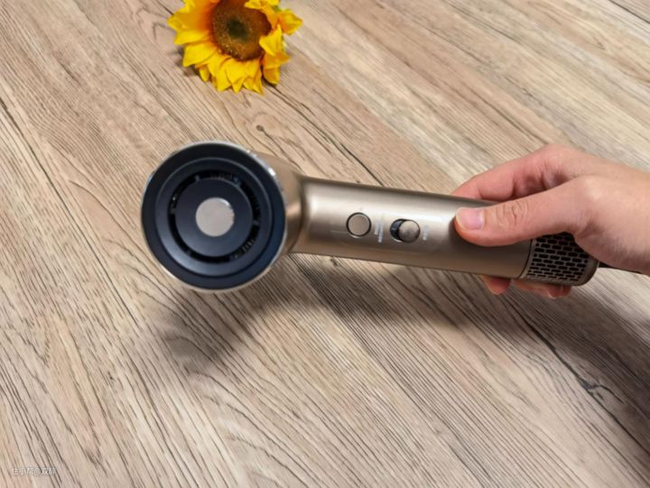 我入手的这台吹风机是刚出不久的鎏光金,全金属的机身比我之前用的塑料壳看起来更高级,而且也不怕刮花。拿起来小小的一只,跟手机差不多的尺寸,但是美中不足的是没有办法折叠。