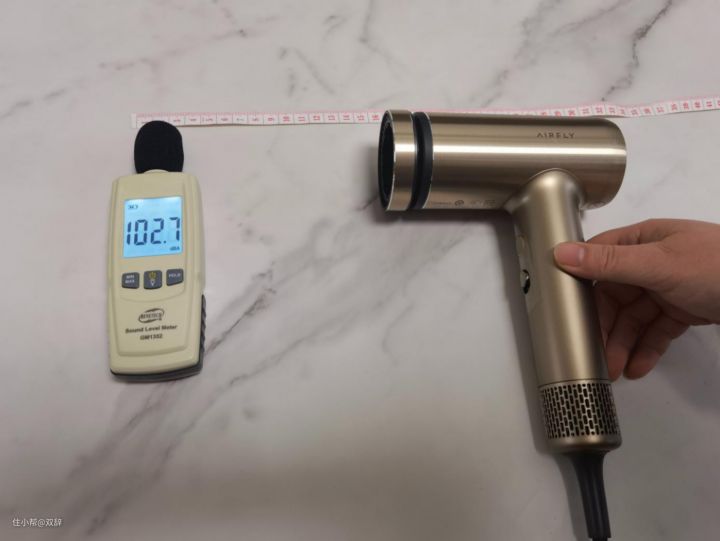 吹风机有噪音是一个普遍现象,用物理现象来解释的话,通风道比较短窄,高速转动时冲刷空气,就会引起风噪音。一般来说,风速越快的吹风机,噪音就会越大。但是噪音之间也有不同,有的十分刺耳,有的就比较柔和一些,甚至还不影响谈话,为了检测这款鱼子酱的噪音,我选择在一定距离上,用测试仪器,开启最高最热的档位进行测试,结果如下: