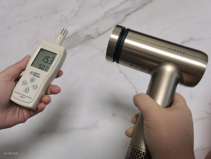 检测AIRFLY鱼子酱的风温为50.7°,还含有15.3%的湿度,在吹风的时候还有相对湿度。我和家人测试下来,哪怕是用高温档位贴近头发吹,也不会觉得很热,更不会像普通吹风机一样容易烫到头皮。