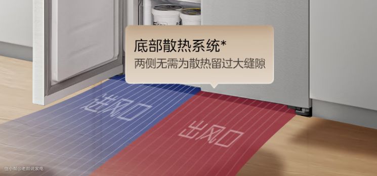 特别是底部散热,底部散热是通过旋涡风扇强力吹走热量,所以散热效率高,同时冰箱的制冷也非常快,其次底部散热的冰箱不需要预留两侧散热空间,为超薄和嵌入式冰箱的真正实现成为可能,对于小户型而言更加能够节省厨房空间。