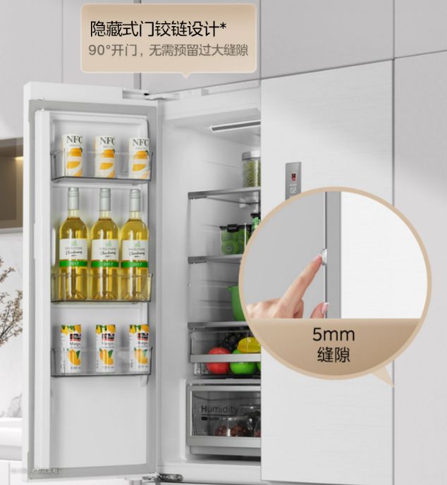- 5mm微缝装嵌:隐藏式门铰链设计,冰箱两侧仅预留5mm即可保证冰箱开门可达到90°,同时底部采用底部散热系统,再也不用像以往两侧需要预留5-10cm的散热空间。
