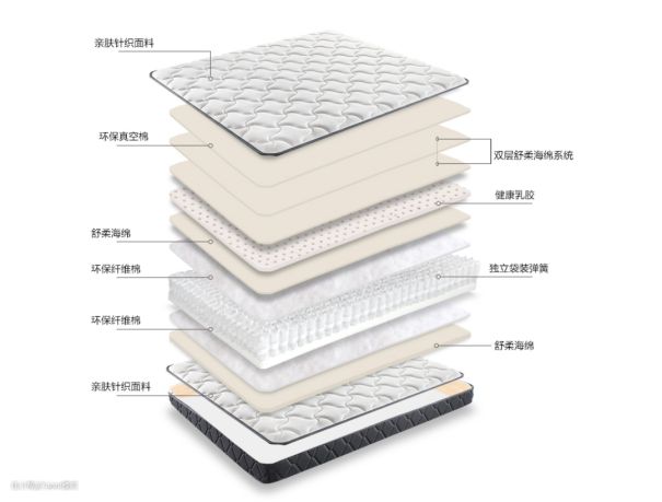 它指的是弹簧床垫+乳胶层的组合,弹簧床垫是以弹簧为支撑层,外加上填充层和面料搭配制作的。床垫的分成结构材质很多,包括乳胶、纤维棉、环保真空棉、舒柔海绵等。(如图)