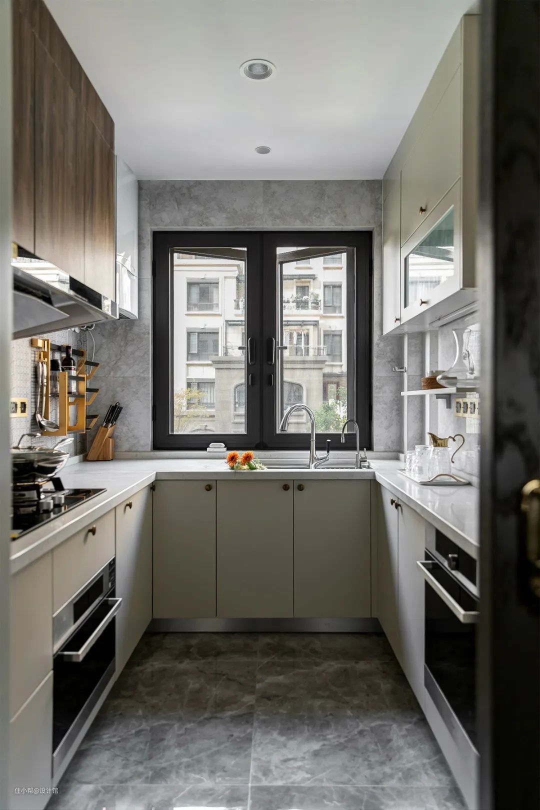 ▲厨房操作台是U字形的格局,洗切炒动线流畅,灰白色的橱柜+原木色吊柜组合,为主人布置出一个现代端庄而又实用方便的厨房空间。