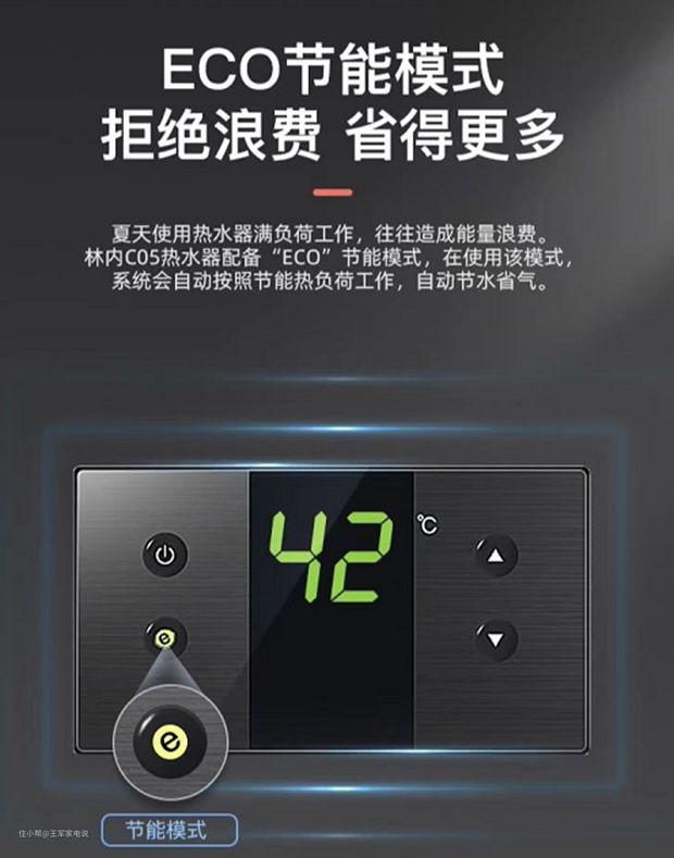 在夏天时,我们洗澡时水温不需要太高,但是热水器会满负荷运转,就会大大浪费燃气。而林内则具备ECO节能模式,当我们调节到这个模式时,热水器会减少点火排工作,从而降低热负荷工作,更加节能。