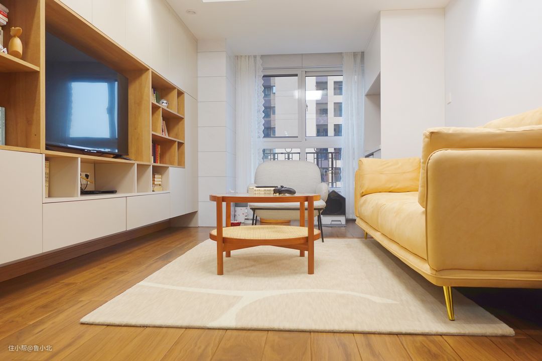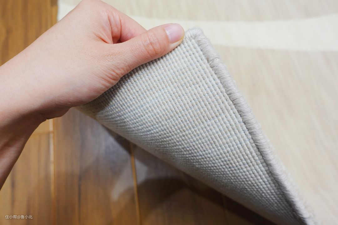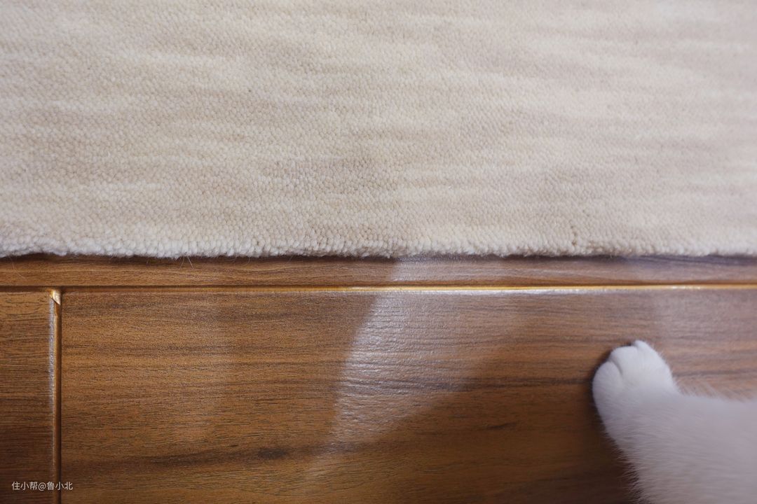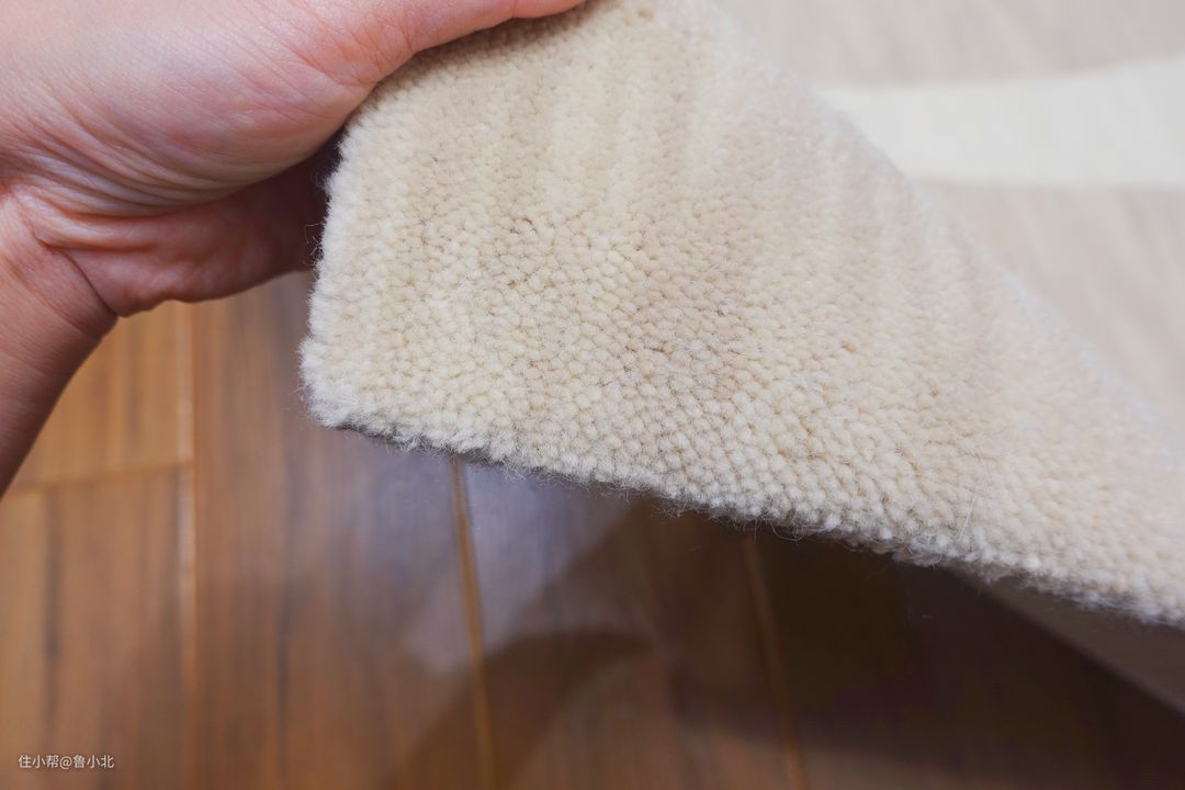 铺好之后先来说说手感,不同于以前非常柔软的地毯,这款全羊毛地毯小北用手按压过,它是能立马恢复原有平整状态,具有一定支撑回弹性, 这个特性小北个人非常喜欢,因为很多地毯按压过是有痕迹,久了就会显得地毯表面凌乱。