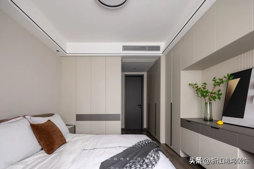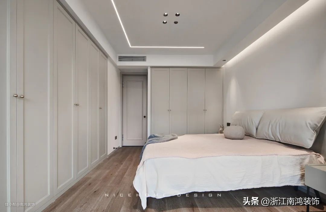 嵌入式衣柜融进墙面,从外面看只能看得到柜门而看不到柜体,颜值上就有了强大的保障。