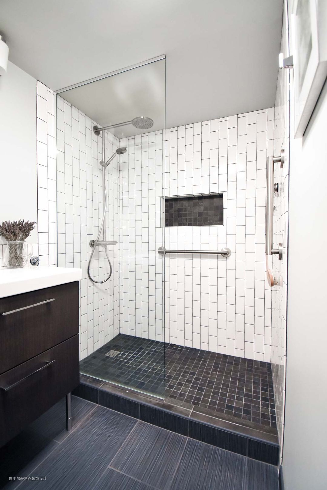 淋浴房矮墙下的空间可以利用起来做壁龛,大的放洗发水沐浴露,小的可以放肥皂。