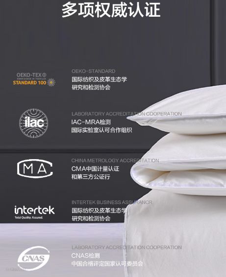 通过欧标一级生态认证,这个认证是绝对的含金量最高之一,通行欧盟,这款是子母被,子被与母被有快捷式定位扣连接,95%白鹅绒,可以抵抗零下15度室温。子母被分为2床被子,可以叠加使用也可以单独使用,较薄的春夏被采用的是威斯丁酒店同款,较厚的采用洲际酒店同款,套上同店的被套就是妥妥的五星级酒店享受了