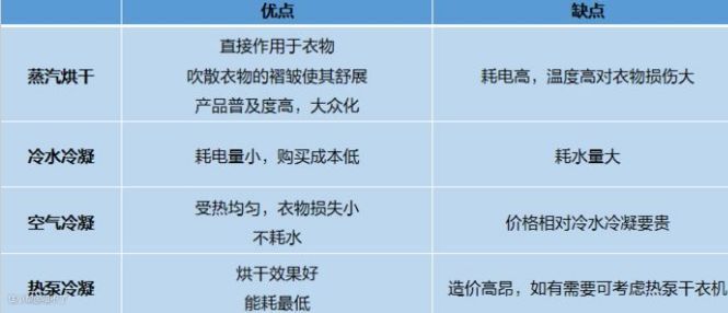 热泵式烘干机则类似于冰箱压缩机,压缩机将冷媒加压升温,通过风将热量传递到衣服上,然后把衣服内的水分蒸发成水蒸气。
