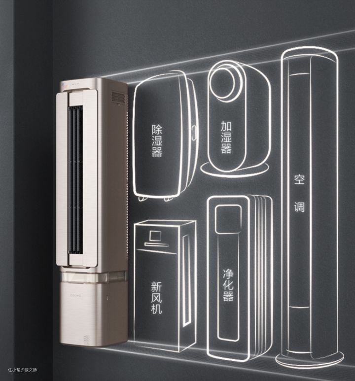 它的聪明之处,就在于“五机合一”,不仅能控制室内的温度(空调机),更能控制湿度(加湿器)、风感(除湿器)、洁净度(空气净化器)、空气新鲜度(新风机),一台等于五台,从五个维度完全hold住室内的空气舒适度。