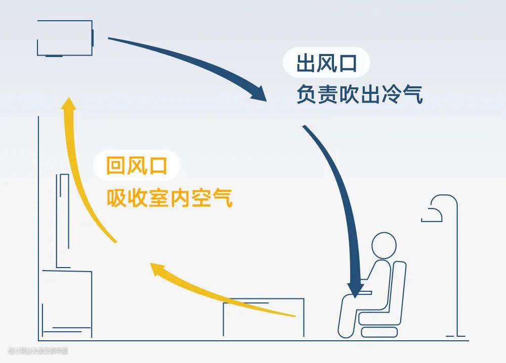 回风口吸进室内热空气,经过室内机冷却,再由出风口吐出冷空气。一呼一吸间,房间的空气就凉快了。
