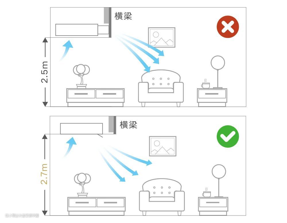 安装小贴士:为防止吹出的冷风被回风口吸走,形成气流短路,需注意出风口和回风口的间隔距离应≥1m。
