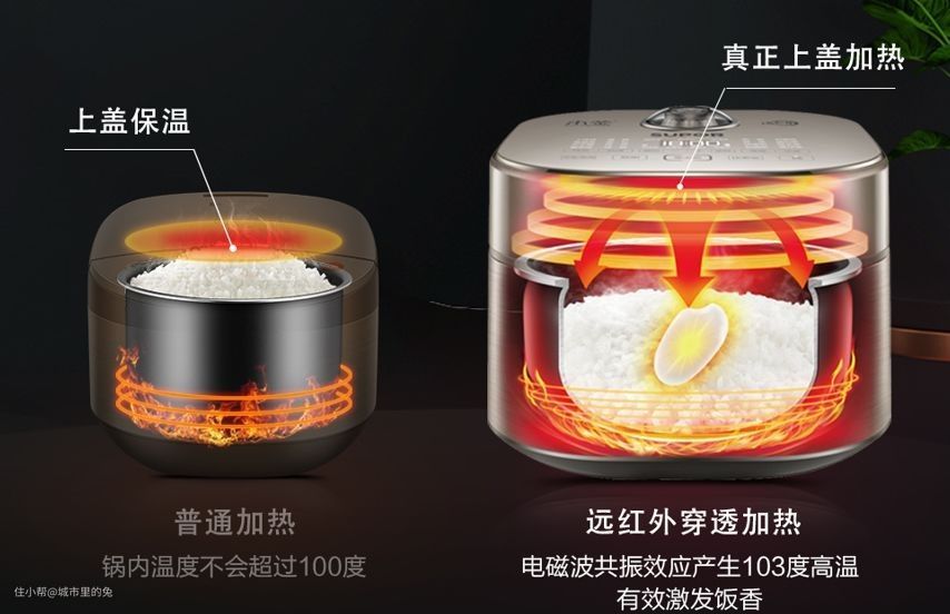 苏泊尔远红外电饭煲的外观是钢化玻璃面板和金属拉丝机身,质感满满;上盖远红外穿透加热技术,搭配底部1300W IH加热技术,相比于传统的底部加热电饭煲,苏泊尔远红外电饭煲的上下立体环绕加热能够直透米芯,能够更好地锁住热量,使得米饭受热均匀并更好地激发出饭香。