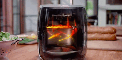 【原理】空气炸锅顾名思义就是利用空气对食物水分进行烘干,利用热风在国内形成的热流对食物进行烘焙,最终达到油炸的效果。它的原理就是在炸锅的顶部安装了一个吹风机,连着一个发热管,底下就是放置食物的炸篮,利用加热管对密闭的锅内温度升高,风扇旋转把热风输送到食物表面,通过热传导的方式加热催熟食物。