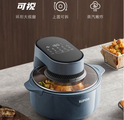 颜值首先很高,12L超大容量,很适合多人口家庭和聚餐时刻,9寸超大耐热玻璃窗直观可见食材变化,看着美食逐渐生成的样子很有意思,防止雾气干扰视线还特别设计为2层玻璃,液晶显示屏按键操作很方便,还可以旋转起来做烤鸡和烤串,让食材每一面都受热均匀