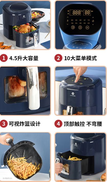 专注小家电27年的大品牌利仁,放心入手,10大智能触控菜单+4.5升大容量!清新复古藏青色很有质感,4.5L大容量可以做整个炸鸡,机盖上还直接标出了各类食材的烘烤时间及温度,还有透明可视窗口观看烹饪情况!设计上非常贴心。简单实用的款式