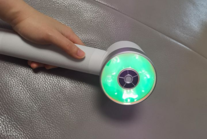 风筒是镜面的材质,插电后发出青绿色的光芒(镜面有120层光学镀膜 ,这就是隔绝所有紫外线伤害的法宝,不会晒黑,不会伤害皮肤),而且不晃眼,满满的酷炫感。
