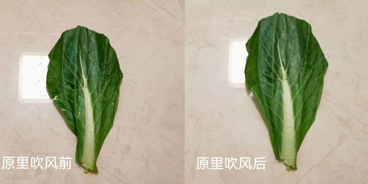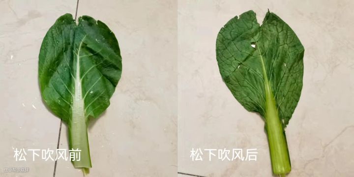 可以很明显的看出来,原里吹风机吹过的菜叶,变化较少;松下吹的呢,整体有点软趴了。一方面我觉得原里是低温吧,水分确实没有那么容易流失。