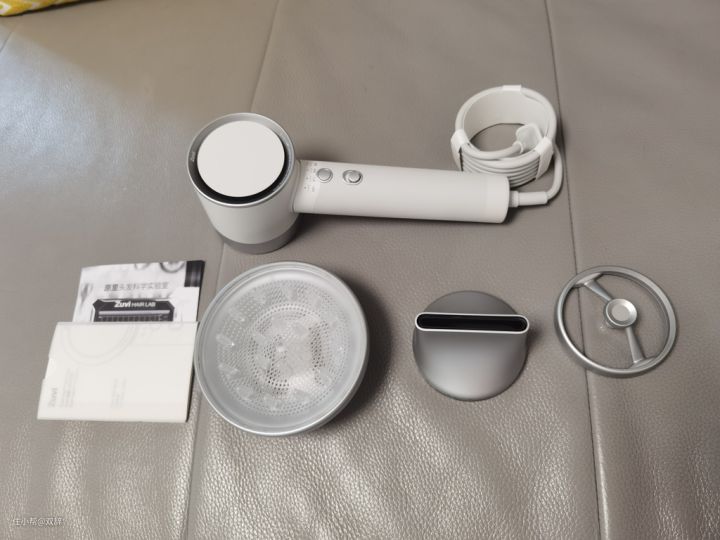 给大家看看全部配件:吹风机,三个风嘴,从左到右分别是扩散风嘴、造型风嘴和柔和风嘴,还有说明书和一本小册子: