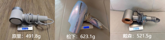 经称量,这款原里吹风机净重491.8g,松下623.1g,戴森521.5g,从数据来看,松下最沉,处于中段的是戴森,最轻的是原里。